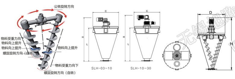 雙螺旋由懸臂驅動,繞筒體中心軸旋轉形成公轉。自轉螺桿旋轉葉片,將物料向上提升,懸臂慢速公轉,將物料做圓周循環運動。螺旋公轉與自轉相互配合,將物料受螺旋旋轉吸收,同時向圓周方向分散。由自轉提升至上部的物料流再向中心匯合,在中心受重力向下的流向,填補底部的空缺帶,從而形成了整體的循環作用混合;